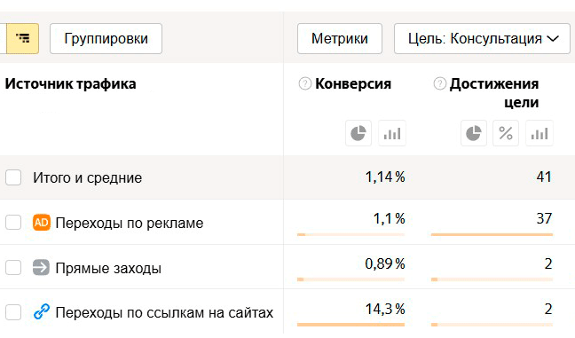 Что касается рекламы, то тут был ещё вопрос по ретаргетингу. По стандарту его надо делать и запускать. Это рекомендация от самого Яндекса. Но если мы возьмём любую конверсию, например "Консультация", то получим данные по ней вот такие: