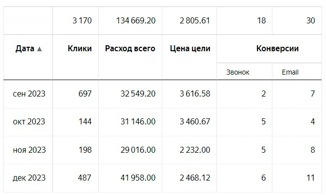 Достижение этих целей указано в таблицах ниже. Конечно, были и повторные заказы, были заявки с других источников (SEO, доски объявлений), но у этого предприятия большую долю занимал канал платной рекламы (Яндекс Директ). В целом всё работало, но хотелось улучшить показатели рекламы, детальнее разобраться в аналитике.